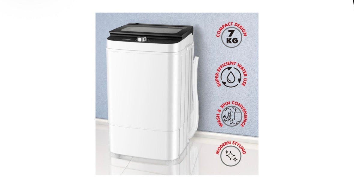 With a 7kg capacity, it’s ideal for everyday laundry loads, offering single tub functionality that combines washing and spinning in one easy-to-use unit. The intuitive dial control allows for quick selection of wash and spin settings, while the energy-efficient operation helps reduce water and electricity usage.